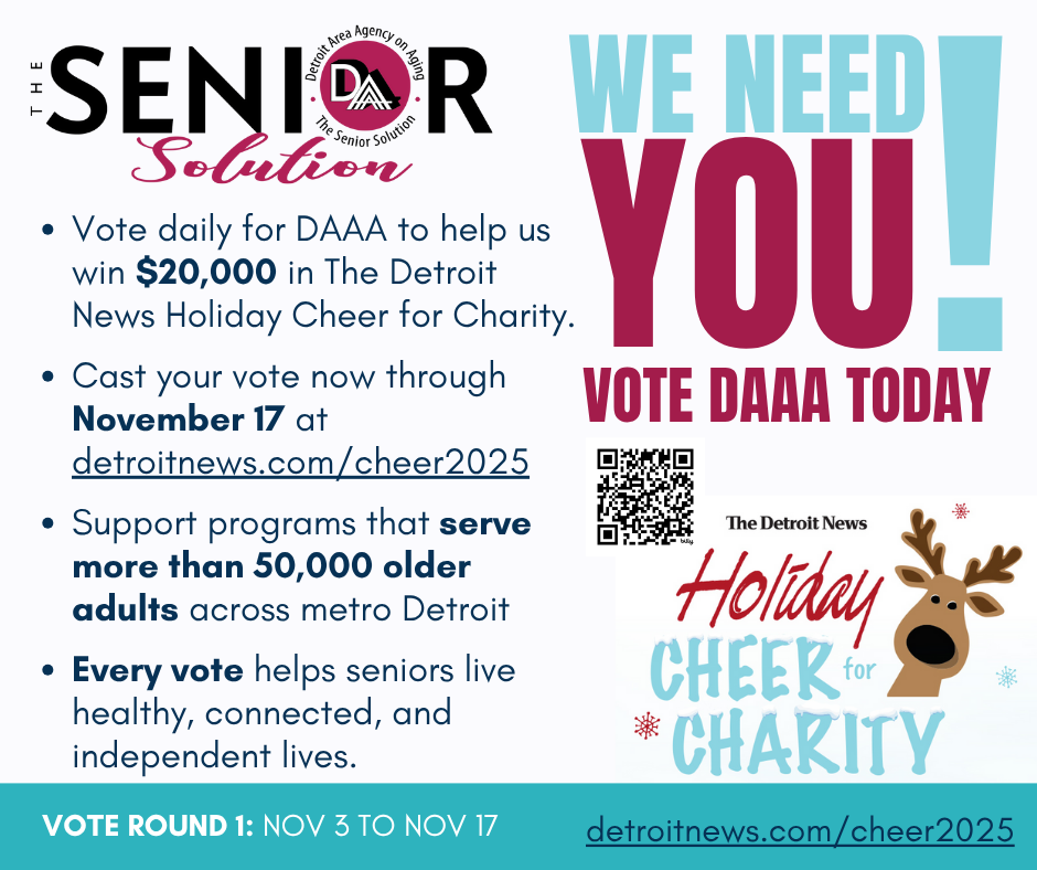 The Detroit Area Agency on Aging (DAAA) is fortunate to be one of 10 non-profit organizations competing to win $20,000 from the Detroit News in its Holiday Cheer for Charity Campaign – an initiative that supports local, community focused non-profit organizations during the holiday season. For DAAA to win, we will need YOUR help through two rounds of voting – first with votes, then with dollars.
